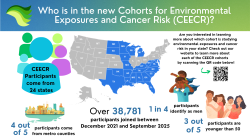 The New Cohorts for Environmental Exposures and Cancer Risk (CEECR) is a collaborative effort co-funded by the National Institute of Environmental Health Sciences (NIEHS) and the National Cancer Institute (NCI). CEECR aims to support innovative scientific research in new prospective cohorts that address knowledge gaps in Cancer etiology and carcinogenesis processes with a focus on Environmental Exposures.